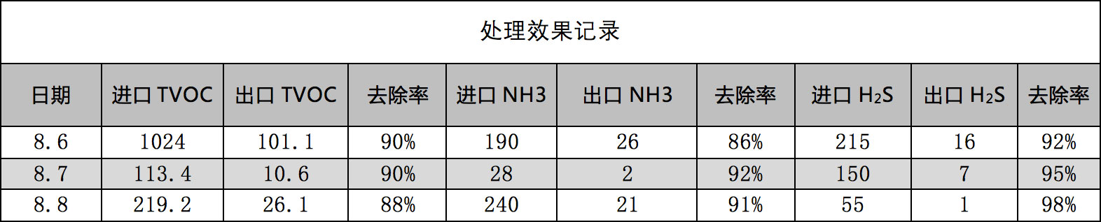 針對氣源的特點,我公司在菌種、填料、系統(tǒng)條件設(shè)置等方面投入研發(fā)力量,取得了較好的效果。7月31日接種,經(jīng)過9天的馴化和調(diào)整,系統(tǒng)的除臭效果已經(jīng)達到了相關(guān)標準的要求。